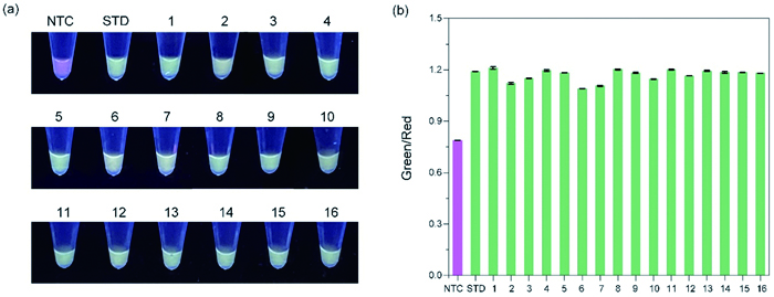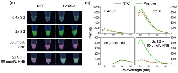 Secondly, when HNB and SG were used in combination, the ratiometric fluorescence signals from SG and HNB rendered negative PCR samples and positive ones with high-contrast color patterns under UV excitation. Although HNB had a greatly weakened fluorescence as compared with SG (Fig. 2b), it provided a strong red color background under UV excitation. By tuning HNB concentration, various patterns of color transition could be achieved. As Fig. 3c displays, increasing HNB concentration resulted in changes as opposed to increasing SG concentration: red became more obvious while green turned less obvious. At 2 × SG, a red-to-green color contrast could be observed between NTC and positive samples with a moderate HNB level (60–90 µmol/L), while pale-to-green at a low HNB level (30 µmol/L) and red-to-pale at a high HNB level (120 µmol/L or more).