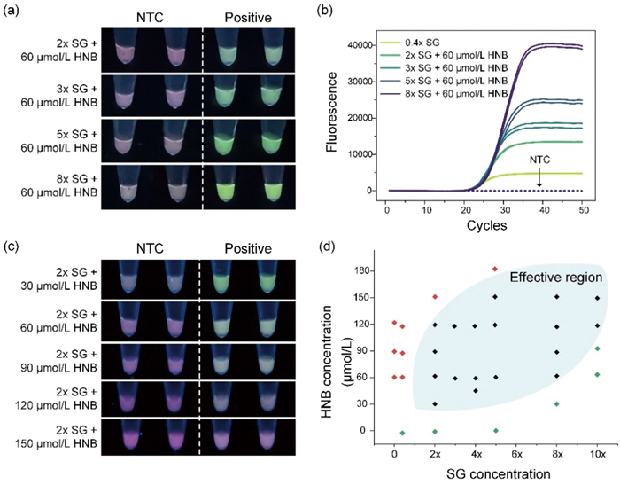 | Fig. 3. Performance of the sensing system at various SG and HNB concentrations. (a) Naked-eye detection of PCR products with 60 µmol/L HNB and SG from 2 × to 8 ×. (b) Real-time PCR amplification curves with 60 µmol/L HNB and SG from 2 × to 8 ×. (c) Naked-eye detection of PCR products with 2 × SG and HNB from 30 µmol/L to 150 µmol/L. (d) Visualization efficacy at various SG and HNB combinations. Red plots: both NTC and positive samples were red under UV excitation; Green plots: both NTC and positive samples were green; Black plots: a red/green contrast between NTC and positive samples. The blue area represents an effective region of dye combinations, within which naked-eye detection is achievable. | |