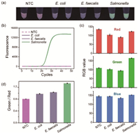 | Fig. 4. Detection specificity among Salmonella and other bacterial pathogens. (a) Naked-eye visualization results. (b) Real-time amplification curves. (c) RGB values of different endpoint PCR products. (d) The Green/Red ratio of different samples. | |