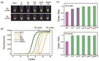 | Fig. 5. Detection sensitivity of Salmonella. (a) Naked-eye visualization results of serially diluted samples. (b) Real-time amplification curves of serially diluted samples. (c) The Green/Red ratio of serially diluted samples after 35 cycles and 50 cycles of PCR amplification, respectively. | |