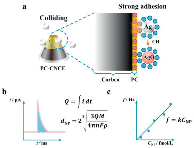 | Fig. 1. PC‑CNCE for single Ag NP collision measurements. (a) In an alkaline environment, negatively charged Ag NPs undergo adhesive collisions with positively charged PC‑CNCE surfaces; at a sufficiently positive potential, Ag NPs are fully oxidized into AgO NPs, maintaining their original surface negativity and anchored to the electrode interface via electrostatic attraction. (b) Integration charge (Q) of single NP collision current transient events used to calculate their particle size (dNP). (c) Linear relationship between theoretical (line) and actual (dots) nano-collision frequency (f) and ultra-low NP concentration (CNP). | |