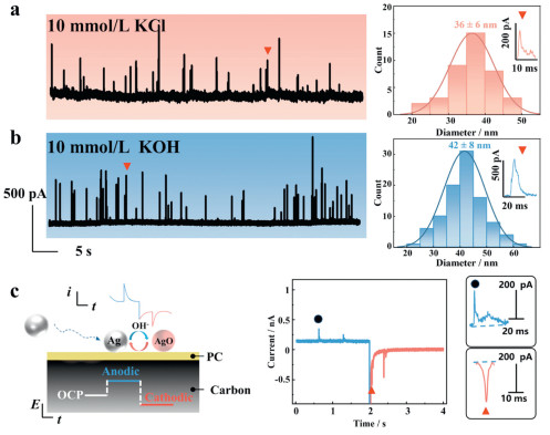 | Fig. 3. Verification of detection principle for Ag NP collisions. (a, b) i-t measurements (60 s duration) at a potential of 600 mV, with electrolytes of 10 mmol/L KCl and 10 mmol/L KOH, both containing 2 pmol/L Ag NPs (40 nm in particle size). Histogram of Ag NPs size distribution and typical current transient events are shown on the right. (c) Schematic of anodic oxidation (blue) and cathodic reduction (red) behavior after single Ag NP landing, with recorded oxidation (blue) and reduction (red) pulse current-time curves upon switching of anodic potential (+600 mV) and cathodic potential (−200 mV), along with typical oxidation (blue) and reduction (red) transient signals. The solution contained 10 mmol/L KOH and 2 pmol/L Ag NPs (40 nm in particle size). Electrochemical conditions: PC‑CNCE and Ag/AgCl (3 mol/L KCl) served as the detection electrode and reference/counter electrodes respectively; sampling frequency was 100 kHz with a low-pass filter frequency of 1 kHz. Transient signal analysis was performed using MinTech software (Fig. S5 in Supporting information). | |