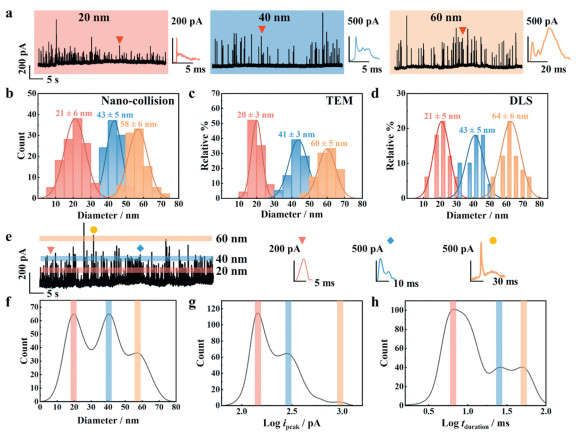 | Fig. 4. Nano-collision measurements of monodisperse and mixed dispersions of Ag NPs. (a) i-t (60 s duration) measurements of Ag NP solutions with particle sizes of 20, 40, and 60 nm, with typical current transient events located on the right side. Histograms of particle size distribution for the three types of Ag NPs as determined by (b) nano-collision measurements, (c) TEM and (d) DLS. (e) i-t (60 s duration) measurement of a solution containing a mixture of 20, 40, and 60 nm (each 2 pmol/L) Ag NPs, with colored bars representing the peak current distribution of Ag NP collision signals for different particle sizes, and typical current transient events on the right side. Histograms showing the distribution of (f) particle size, (g) Log tduration and (h) Log ipeak for polydisperse Ag NPs as determined by nano-collision measurements. Electrochemical conditions: PC‑CNCE and Ag/AgCl (3 mol/L KCl) were used as the sensing electrode and reference/counter electrode, respectively; an applied potential of 600 mV, and an electrolyte of 10 mmol/L KOH; sampling frequency and low-pass filter frequency were set at 100 kHz and 1 kHz, respectively. | |