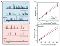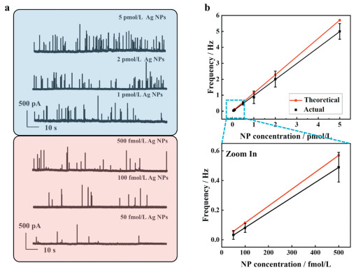 | Fig. 5. Ultra-low Ag NP concentration measurement. (a) i-t measurements (60 s duration) at a potential of 600 mV. The electrolyte was 10 mmol/L KOH, containing Ag NPs ranging from 50 fmol/L to 5 pmol/L (40 nm). Sampling frequency and low-pass filtering frequency were set at 100 kHz and 1 kHz, respectively. Ag/AgCl (3 mol/L KCl) served as the reference and counter electrodes. (b) Linear relationship between the collision frequency of Ag NPs and their concentrations, where the red dashed and black dashed lines represent the theoretical and actual calibration curves of nano-collision frequency versus concentration, respectively. | |