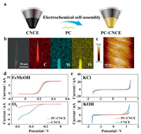 | Fig. 2. Preparation and characterization of PC‑CNCEs. (a) Schematic representation of the preparation of PC‑CNCEs via PC electrochemical self-assembly on CNCEs. (b) SEM image and EDX mapping of a PC‑CNCE. (c) AFM image of the surface of a PC‑CNCE. (d) Cyclic voltammetry of a CNCE and a PC‑CNCE in 1 mmol/L FcMeOH and 1 mol/L KCl solution (top) and linear sweep voltammetry in an O2-saturated 0.1 mol/L KOH solution (bottom). (e) Electrochemical window of a CNCE and a PC‑CNCE in 0.1 mol/L KCl (top) and 0.1 mol/L KOH (bottom) solutions. In electrochemical measurements, the scan rate for voltammetry was 50 mV/s, and Ag/AgCl (3 mol/L KCl) served as the reference and counter electrodes. | |