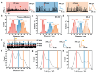 Fig. 4a illustrates nano-collision records of Ag NP solutions with particle sizes of 20, 40, and 60 nm, revealing the transient event characteristics of peak shape, peak current, and peak width for Ag NPs of various sizes. Coulombic quantitation analysis yields Ag NP particle sizes concentrated at 21, 43, and 58 nm (Fig. 4b and Fig. S12 in Supporting information), consistent with measurements from transmission electron microscopy (TEM; Fig. 4c) and dynamic light scattering (DLS; Fig. 4d). Compared to previous studies, PC‑CNCE demonstrates excellent accuracy in detecting monodisperse Ag NPs, attributed to significantly enhanced electrostatic attraction facilitating adhesion between reactant Ag and product AgO NPs and the electrode interface. Based on this feature, further exploration for discriminating mixed-size Ag NPs was pursued to meet the analysis demands for polydisperse Ag NPs. Fig. 4e presents nano-collision measurements of Ag NP solution containing mixed sizes of 20, 40, and 60 nm (each at 2 pmol/L). Colored bands depict peak currents clustered at different amplitude levels corresponding to different sizes of Ag NPs. Typical transient events exhibit signal characteristics akin to those observed during single-size measurements. The average particle sizes of Ag NPs derived from these transient event sets are 20, 40, and 59 nm, respectively (Fig. 4f), consistent with results from single-size nano-collision measurements. Furthermore, statistical analysis of peak currents (Fig. 4g) and peak widths (Fig. 4h) from transient event sets reveal characteristic distributions of different-sized Ag NPs. Thus, PC‑CNCE, as an advanced analytical tool, is capable of in situ and accurate discrimination of size distributions of Ag NPs in solution mixtures. Compared to traditional size analysis methods such as SEM, TEM and DLS, this method offers the advantages of low cost, simplicity, and high throughput, promising new breakthroughs in the field of size analysis.