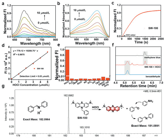 | Fig. 2. ROS responsive properties of SW-100. (a) Normalized fluorescence and (b) absorption spectra of SW-100 (5 µmol/L in PB, pH 7.4) in the presence of different concentrations of HOCl (0–10 µmol/L). (c) Time-dependent changes in the fluorescence intensity of SW-100 (5 µmol/L) at 686 nm after adding HOCl (15 µmol/L). (d) The linear relationship between the fluorescence intensity at 686 nm of SW-100 and the concentration of HOCl (the detection limit is included). (e) Fluorescence intensity of SW-100 (5 µmol/L in PB, pH 7.4) at 686 nm after adding various ROS (from left to right: HOCl (10 µmol/L), H2O2, TBHP, ROO•, NO, KO2, ONOO–, •OH, TBO• with concentration of 100 µmol/L. (f) HPLC analysis of the reaction of 5 µmol/L SW-100 with 15 µmol/L HOCl (254 nm). (g) The HRMS spectra of (E)-N,1-diphenylmethanimine produced by benzaldehyde condensation with aniline. | |