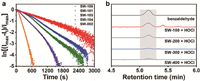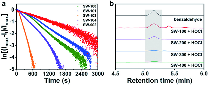 | Fig. 3. (a) Pseudo-first-order kinetic plot of the reaction of 5 µmol/L probes (SW-002, SW-100, SW-101, SW-103, SW-104) to 15 µmol/L HOCl. (b) HPLC analysis of the reaction of 5 µmol/L different probes (SW-100, SW-200, SW-300, SW-400) to HOCl (15 µmol/L) and standard compound benzaldehyde (254 nm). | |
