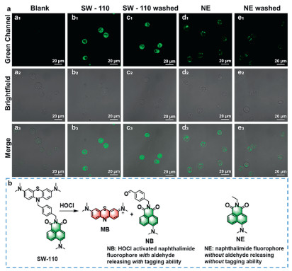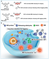 | Fig. 1. (a) Previously reported HOCl-activated carboxyl release probe FDOCl-12 and the designed HOCl-activated aldehyde release probe SW-100 in this work. (b) The proposed mechanism of HOCl-activated aldehyde release within cells for tagging application. | |