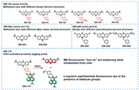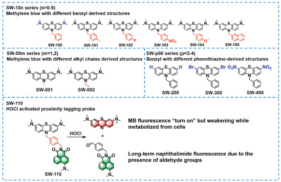 In our earlier research, we successfully synthesized a series of leucomethylene blue (LMB) derivatives containing amide bonds. These compounds could be activated by HOCl to release carboxyl compounds (e.g., FDOCl-12 in Fig. 1a). This observation prompted us to investigate whether a similar response would happen if the carbonyl group was directly replaced with an alkyl group, realizing the release of aldehyde in a mild condition. Actually, the oxidation of methylene-amino structures to aldehyde groups generally needs the help of metal catalysts [35] or enzymes [65], which is not benefit for its application in physiological conditions. It was excited to know that ROS could oxidize and break the carbon-nitrogen bonds between tertiary amines attached to phenol [66-69] or benzyl [70]. Since LMB happens to have an easily functionalized active nitrogen atom whose binding groups determine their ROS stimulation performance and the released molecular type (Fig. 1a), an aldehyde group release strategy activated by HOCl may be discovered via an ingenious structural design. We therefore designed MB-benzyl derivatives SW-100 based on LMB at first (Fig. 1a). It was exciting that SW-100 could release benzaldehyde under physiological conditions activated by HOCl. Multiple types of probes were thus developed based on this strategy (Scheme 1). All these compounds could release aldehyde groups in the presence of HOCl to some extent. Our research confirmed the universality of the strategy and elucidated the extent to which the strategy could be adapted. Following the activation of the probe, the released benzaldehyde group could be subsequently anchored within the cell. This further illustrated that the new proximity tagging strategy could be successfully used at the cellular level (Fig. 1b).