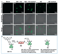 | Fig. 5. (a) CLSM images of HL-60 cells incubated with SW-110 (10 µmol/L) and NE (10 µmol/L) while one of each group of cells were washed by PBS every 6 h for 24 h. λem = 540 ± 60 nm, λex = 405 nm. Scale bar = 20 µm. (b) SW-110 reacted with HOCl to exhibit two kinds of fluorescence. | |
