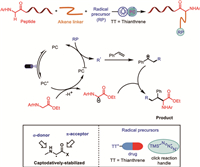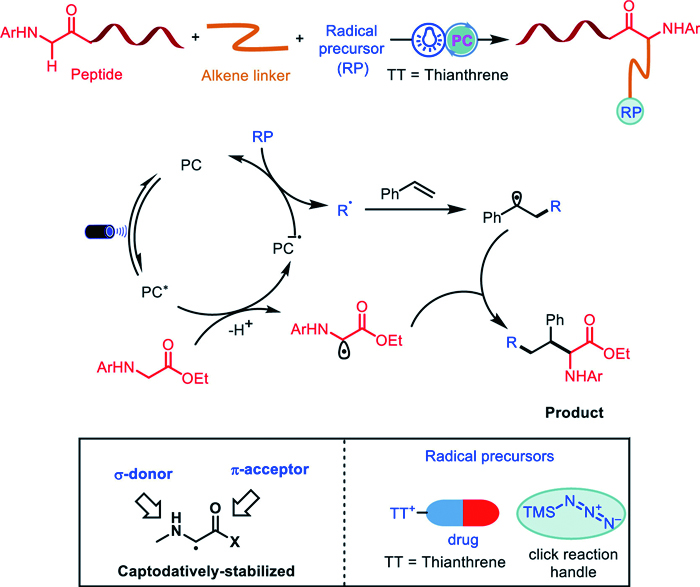 Through photoredox catalytic processes, the reaction enables the modular incorporation of functional groups under mild conditions, offering broad substrate scope and excellent functional group tolerance. The advantage of using aryl thianthrenium salt as the coupling partner is represented by the ability to integrate pharmacologically relevant fragments with amino acids/peptides, providing straightforward pathway for the synthesis of peptide-drug conjugates. While azide functionality is well known as the click handle for ligating two bio-relavant fragments. Considering the growing importance of amino acid and peptide modifications in the pharmaceutical industry, the development of stabilized carbon radical-mediated reactions is anticipated to continue to thrive in the coming years.