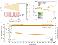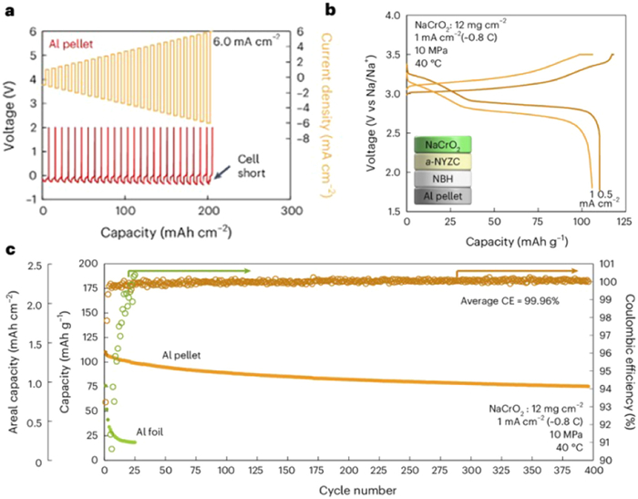 | Fig. 2. (a) Critical current density when cycling 6 mAh/cm2 capacity with Al pellet current collectors. (b) Voltage curves of a Na anode-free solid-state battery. (c) Cell capacity over 400 cycles. Reproduced with permission [3]. Copyright 2024, Springer Nature. | |