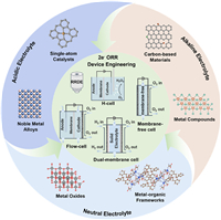 | Fig. 1. Schematic diagram of catalytic mechanism and design principles for 2e− ORR under different pH conditions and device engineering for H2O2 electrosynthesis. | |