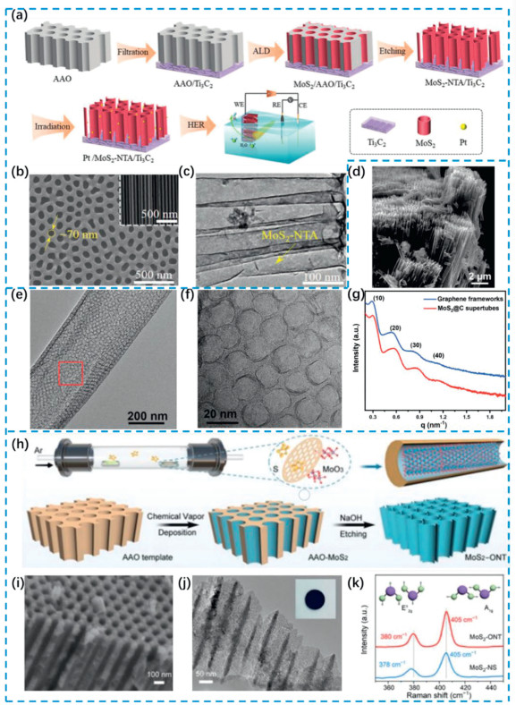 | Fig. 1. (a) Experimental flowchart for the synthesis processes of Pt/MoS2–NTA/Ti3C2. (b) the upper surface and cross-section (the inset) of AAO. (c) TEM image of MoS2–NTA in MoS2–NTA/Ti3C2. Reproduced with permission [45]. Copyright 2022, Wiley-VCH GmbH. (d) Low-magnification SEM images of tubular graphene frameworks existing as 1D arrays. (e) TEM image of a single MoS2@C supertubes. (f) HRTEM image of the region indicated by the square in (e). (g) SAXS patterns of MoS2@C supertubes and tubular graphene frameworks. Reproduced with permission [66]. Copyright 2023, Wiley-VCH GmbH. (h) Schematic diagram of preparing MoS2–ONT by template method. (i) SEM and (j) TEM images of MoS2–ONT. Inset: The optical photo of MoS2–ONT. (k) Raman spectra of MoS2–ONT and MoS2–NS. Reproduced with permission [67]. Copyright 2023, Wiley-VCH GmbH. | |