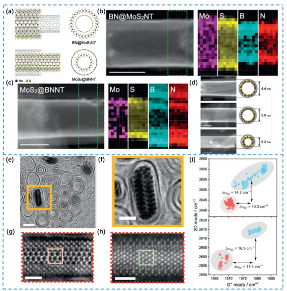| Fig. 2. (a) Schematic illustration of the atomic structure of a single-walled MoS2 nanotubes that grows coaxially inside and outside the BNNT template. (b) HAADF-STEM, and (c) EELS chemical maps of the BN@MoS2NT and MoS2@BNNT, respectively. Scale bars: 5 nm. (d) MoS2 nanotubes with different tube diameters are confined to BNNT. Scale bars: 3 nm. Reproduced with permission [46]. Copyright 2023, Wiley-VCH GmbH. (e) Atomic-resolved cross-sectional BF images of single-layered flattened NbSe2 nanotubes. (f) Enlarged image of the yellow box area in (e). (g) ADF image of NbSe2 flat tube in AB-stack mode and (h) AA-stacked NbSe2 flat tube with filled honeycomb structure. (i) Raman mode scatter plots of samples at 532 nm (up) and 633 nm (down) laser excitation wavelengths and correlation of 2D band positions with G-band positions. Primitive CNTs and NbSe2@CNT flat heterogeneous tubes were marked with red squares and blue circles, respectively. Reproduced with permission [69]. Copyright 2024, Springer Nature. | |