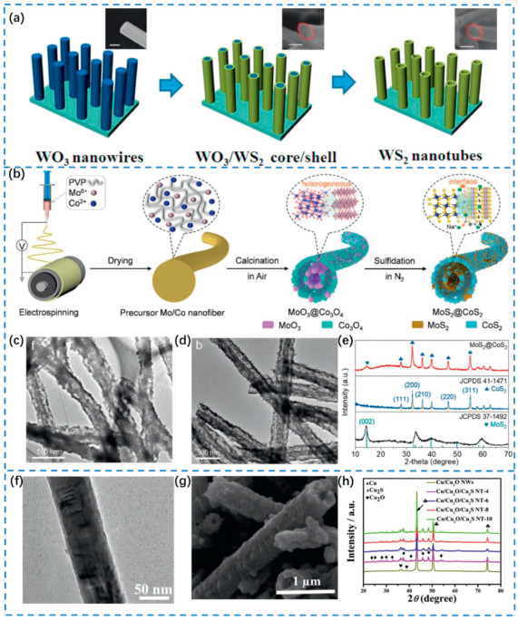 | Fig. 3. (a) Growth process of WO3 NWs converting to WS2, WSe2, and WS2(1 - x)Se2x nanotubes on CFs by sulfuration and selenization. Reproduced with permission [47]. Copyright 2014, American Chemical Society. HRTEM image of (b) schematic diagram of preparing MoS2@CoS2 heterostructure tube-in-tube hollow nanofibers. (c, d) TEM images of MoO3@Co3O4 and MoS2@CoS2 tube-in-tube nanofibers. (e) XRD pattern of MoS2@CoS2 tube-in-tube nanofibers. Reproduced with permission [74]. Copyright 2024, Elsevier B.V. (f) TEM of as-prepared Cu/Cu2O NWs. (g) FESEM images of as-prepared Cu/Cu2O/Cu2S NT. (h) XRD patterns of Cu/Cu2O NWs, and Cu/Cu2O/Cu2S NT for 4, 6, 8, 10 h. Reproduced with permission [75]. Copyright 2019, Elsevier B.V. | |