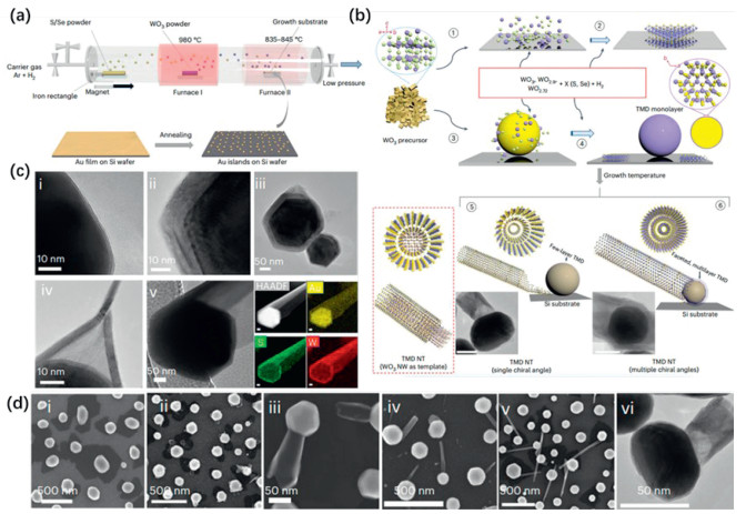 | Fig. 4. (a) Preparation of Au NPs catalyst and CVD growth of TMD nanotubes. (b) The growth mechanism of TMD nanotubes, shown in the dashed line box, is a schematic diagram of metal oxide NWs vulcanization to prepare TMDs nanotubes. (c) TEM images of the growth of WS2 nanotubes at ~840–845 ℃. The EDS map is in the bottom right corner. HAADF, high Angle ADF. (d) SEM images of the growth process of WS2 nanotubes at ~835–840 ℃. Reproduced with permission [76]. Copyright 2023, Springer Nature. | |