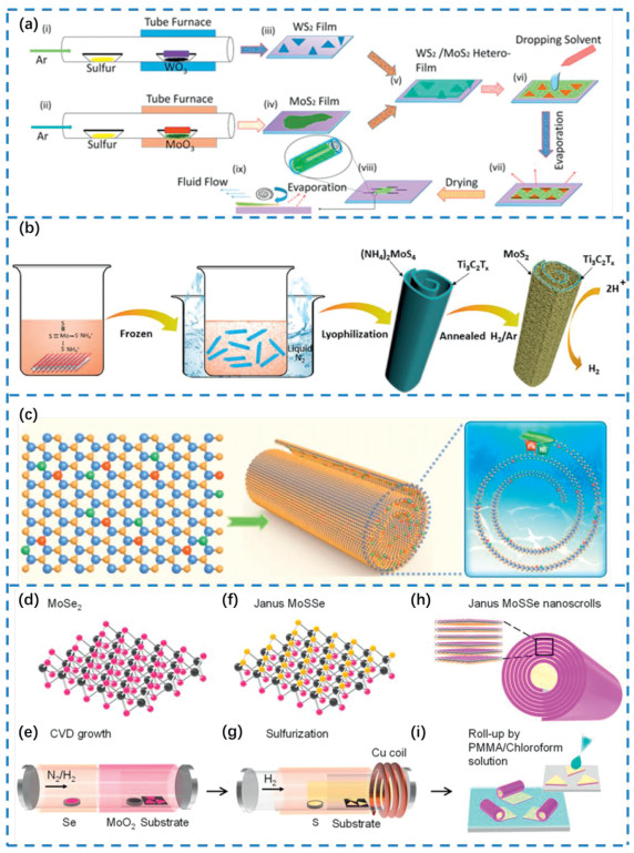 | Fig. 5. (a) Schematic diagram of steps for preparing WS2/MoS2 heterojunction nanoscroll (NS). Reproduced with permission [82]. Copyright 2022, American Chemical Society. (b) The “nanoroll” MoS2/Ti3C2Tx hybrid material was prepared by the method of liquid nitrogen-freezing and subsequent annealing. Reproduced with permission [83]. Copyright 2018, Elsevier B.V. (c) The diagram of precisely assembling dual (Das) within in two adjacent layers in a nanoscroll structure. Reproduced with permission [84]. Copyright 2023, John Wiley & Sons, Inc. (d) Structure model of monolayer MoSe2. (e) The process diagram of preparing monolayer layer MoSe2 on SiO2/Si substrate with MoO2 and Se as raw materials at 870 ℃. (f) Structure model of Janus monolayer MoSSe. (g) Diagram of hydrogen plasma-assisted sulfurization process. (h) Structure model of Janus MoSSe nanoscrolls. (i) Rolling up process of Janus monolayers by spincoating of a PMMA/chloroform solution. Reproduced with permission [85]. Copyright 2024, American Chemical Society. | |