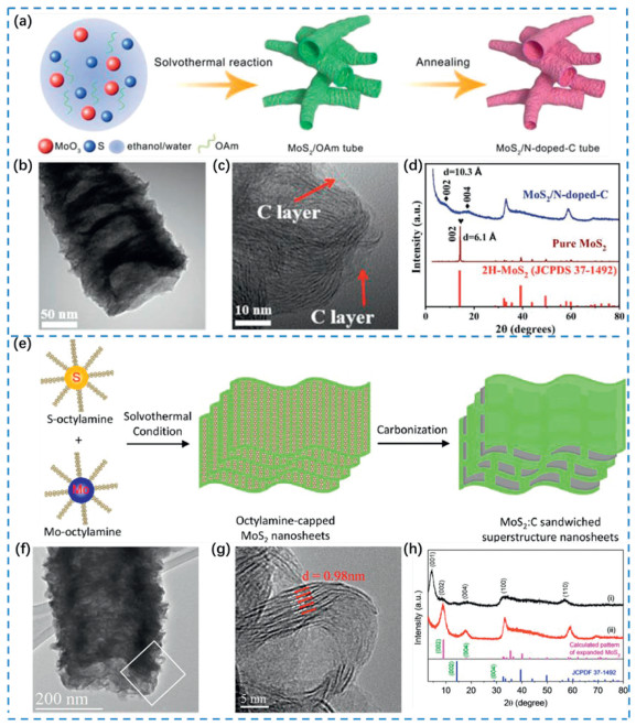 Jia et al. [49] synthesized MoS2/OAm tubes with layer stacked structure based on solvothermal method using MoO3 as molybdenum source, S powder as sulfur source, oleylamine (OAm) as a key additive and ethanol-water solution as a mixed solvent. The OAm existed in the gap between MoS2 layers as an intercalation, while encapsulated single-layer MoS2 as an encapsulating agent. The MoS2/OAm tube was converted to a MoS2/N-doped-C tube by further thermal treatment (Fig. 6a). As shown in Figs. 6b and c, TEM images confirmed that the MoS2/N-doped C tube surface was formed by alternating stacking of multilayer MoS2 nanosheets and N-doped C layers. Fig. 6d showed the XRD pattern of the prepared MoS2/N-doped-C tube, which confirmed that the spacing of MoS2 layers increased due to the alternating stacking of the N-doped-C layer and the MoS2 nanosheets.