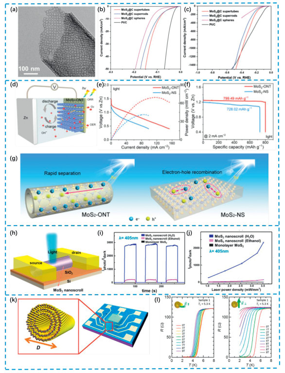 | Fig. 7. (a) TEM images of tubular graphene frameworks. (b) Polarization curves of various MoS2@C catalysts. (c) Polarization curves at high current densities. Reproduced with permission [66]. Copyright 2023, Wiley-VCH GmbH. (d) Schematic diagram of MoS2–ONT for the preparation of a photo-assisted Zn−air battery. (e) Discharge polarization and power density curves of the photo-assisted Zn−air batteries with MoS2–ONT and MoS2–NS cathodes with light on, respectively. (f) The specific capacity of the Zn–air battery at a current density of 2 mA/cm2 under irradiation. (g) Schematic diagram of the photogenerated electron-hole pairs separation process. Reproduced with permission [67]. Copyright 2023. Wiley-VCH GmbH. (h) Schematic diagram of photoelectric detection device based on MoS2 nanoscrolls. (i) Photocurrent-dark current ratio of molybdenum disulfide nanosheets and NS photodetectors. (j) Under 405 nm laser irradiation, the PDR curves of MoS2 nanosheets, MoS2 nanoscrolls (H2O) and MoS2 nanoscrolls (ethanol) change with the laser power density, respectively. Reproduced with permission [103]. Copyright 2022, American Chemical Society. (k) Schematic of a WS2 nanotube electric-double-layer transistor. (l) Temperature-dependent diagrams of resistance under magnetic fields parallel to and perpendicular to the axis of nanotubes during superconducting transition. Reproduced with permission [104]. Copyright 2024, American Chemical Society. | |