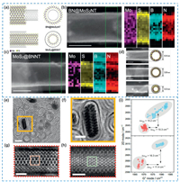 Yusuke et al. [46] studied the vapor-phase growth of single-walled MoS2 nanotubes with various diameters. As shown in Fig. 2a, BN@MoS2NTs and MoS2@BNNTs were prepared based on the outer and inner walls of the BNNTs template, respectively. Based on the growth positions, the nanotubes had different diameters. Figs. 2b and c showed the HAADF-STEM images of BN@MoS2NTs and MoS2@BNNTs. The results indicated that the outer MoS2 wall of BN@MoS2NTs was much brighter than the inner BNNT core, while the inner wall center part of MoS2@BNNTs was brighter. EELS chemistries of BN@MoS2NTs and MoS2@BNNTs (Figs. 2b and c) showed the specific distribution of Mo and S elements on the outermost layer and inner walls of BNNTs, confirming two distinct coating structures. In addition, MoS2@BNNTs protected the ultrathin MoS2 nanotubes from electron beam damage and oxidation due to the protection of the external BNNTs template. Therefore, the inner cavities of BNNTs allowed the preparation of ultrathin MoS2 nanotubes with diameters below 5 nm (Fig. 2d), which was critical to facilitate further preparation and research of single-wall TMD nanotubes. The BNNT template reaction provided a versatile platform that could be applied to further prepare various TMD nanotubes with better performance.