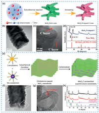 | Fig. 6. (a) Synthesis process of the porous MoS2/N-doped-C nanotube. (b, c) TEM and HRTEM image of the porous MoS2/N-doped-C nanotube. (d) XRD patterns of pure MoS2 and MoS2/N-doped-C nanotubes. Reproduced with permission [49]. Copyright 2018, Wiley-VCH Verlag GmbH & Co. KGaA, Weinheim. (e) Schematic diagram of the preparation process of MoS2:C superstructure nanosheets. (f) TEM and (g) HRTEM images of the MoS2:C superstructure nanotubes after post thermal treatment. (h) XRD patterns of (ⅰ) the as-prepared MoS2:C nanotubes and (ⅱ) the annealed MoS2:C nanotubes. Reproduced with permission [98]. Copyright 2016, Elsevier Ltd. | |