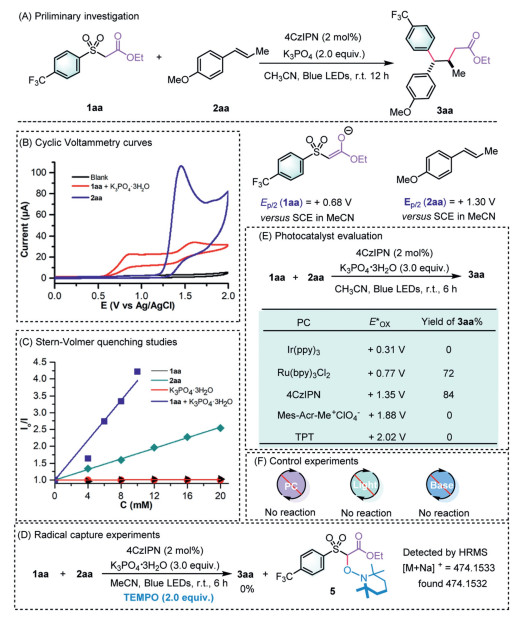 To test the feasibility of our hypothesis and inspire the future development of novel bifunctional reagents for alkene difunctionalization, we selected arylsulfonyl acetate 1aa and trans-anethole 2aa as model substrates for our initial investigations. To our delight, when 4CzIPN was employed as the photocatalyst and K3PO4 as the base, the desired γ,γ-diaryl ester 3aa could be formed in 76% yield with excellent diastereoselectivity (Fig. 2A). Then, cyclic voltammetry (CV) measurements were carried out to elucidate the oxidative process underlying this photocatalytic event. Compound 1aa displayed the first distinct oxidation at Ep/2 = + 0.68 V (vs. SCE in CH3CN) in the presence of base, while that of trans-anethole 2aa was determined to be Ep/2 = + 1.30 V (vs. SCE in CH3CN) which is consistent with the reported data (Fig. 2B) [61,62]. Given the redox potential of the photocatalyst 4CzIPN (*E1/2 (PC*/PC- = +1.35 V vs. SCE in MeCN) enables the thermodynamically favorable oxidation of both reactants, further experiments were performed. Stern-Volmer fluorescence quenching experiments revealed a notably faster quenching rate for 1aa in the presence of a base compared to 2aa, while pure 1aa is entirely unresponsive (Fig. 2C). Moreover, upon the introduction of 2.0 equiv. of the radical scavenger TEMPO into the reaction mixture, the reaction was entirely inhibited, concomitant with the detection of TEMPO adduct 5 (Fig. 2D). These results demonstrate that the crucial radical species derived from bifunctional reagent 1aa actively participated in this cascade transformation. As anticipated, Ir(ppy)3 possessing a relatively low oxidative potential (EIr(Ⅱ)/Ir(Ⅲ)* = +0.31 V) [63,64] exhibited completely inertness in the reaction. While Ru(bpy)3Cl2 with an oxidation potential positioned between those of 1aa and 2aa was employed as the photocatalyst, the desired product 3aa can be obtained with a 72% yield. Intriguingly, switching the photocatalyst to Mes-Acr+-MeClO4- or TPT which were commonly used for alkene radical cation species generation [65-70], resulted in no detection of 3aa (Fig. 2E). Taken together, these data provide support for single-electron oxidation of bifunctional reagent 1aa to initiate this radical difunctionalization reaction.