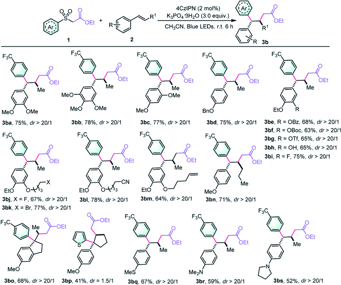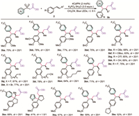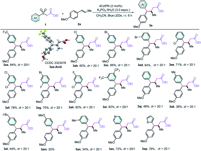 Further optimization of reaction parameters, including the photocatalyst, base, and solvent, led us to identify the optimal conditions to achieve an 84% yield of product 3aa with >20:1 diastereoselectivity (For details, see Supporting information). Control experiments indicated that the photocatalyst, light irradiation, and K3PO4·3H2O were all ciritical to the cascade transformation, as the absence of any of these components resulted in no detection of the desired product (Fig. 2F). To the best of our knowledge, this reaction not only presents a novel alternative for the consecutive formation of multiple C‒C bonds, leading to the synthesis of γ,γ-diaryl esters but also introduces a complementary mechanistic activation mode for the sulfonyl bifunctional reagent-mediated difunctionalization of alkenes.