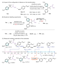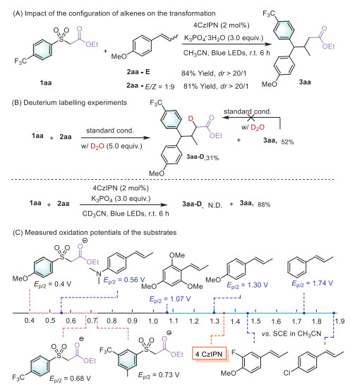 To gain additional insights in the reaction mechanism, several control experiments were performed (Scheme 4). First, standard conditions were applied to two independent experiments using trans-anethole and a 1:9 mixture of trans- and cis-anethole. In both cases, identical products were formed in comparable yields, with almost identical diastereoselectivity. This indicated that a stepwise process is involved in the reaction. In addition, a deuterium labelling experiments was performed. Introducing 5 equiv. of D2O to the reaction mixture under standard conditions resulted in the isolation of 31% yield of deuterium-labeled 3aa-D, along with the formation of 52% yield of 3aa. However, treating 3aa with D2O under the standard conditions did not lead to the detection of 3aa-D. Furthermore, when the reaction was performed in CD3CN with K3PO4 as the base, no deuterium was observed on the product. Considering the rather hydridic nature of the proton on substrate 1aa and radical polarity-match effect, we concluded that a radical polar crossover-enabled protonation might be operational in this cascade process. Moreover, we further measured the oxidation potentials of the substrates. Generally, all the arylsulfonyl acetates exhibited good compatibility with the redox potential of the photocatalyst, ranging from 0.4 V to 0.73 V, which is considerably lower than that of alkenes (1.07–1.89 V). It is worth mentioning that all the oxidation potentials for the arylsulfonyl acetates were determined in the presence of a base. This aligns with their effective fluorescence quenching observed in experiments involving a base, which indicated a deprotonation and oxidation sequence is involved. Interestingly, the dialkylamino-substituted phenyl alkene exhibited an oxidation potential of 0.56 V, even lower than that of compound 1aa. Further fluorescence quenching experiments indicated that these two alkenes are much more efficient quenchers of the photocatalyst (see Supporting information). These results suggest that different mechanisms might be operating in the cascade transformation depending on the olefinic partner (Fig. S12 in Supporting information).