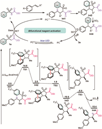 Drawing upon the control experiments and prior literatures [35-37], a plausible mechanism for the majority of the difunctionalization was proposed, as depicted in Scheme 5. And it was further confirmed by density functional theory (DFT) calculations. Initially, the photocatalyst (PC) is irradiated by blue light to its excited state, which undergoes a single electron transfer event with 1a in the presence of base to afford alkyl radical Ⅰ. Electrophilic radical addition to the double bond of alkene forms benzyl radical Int1. Subsequently, radical Int1 undergoes ipso-radical addition to the aryl ring via a π-π stacked transition state TS1 with a Gibbs free energy barrier of 14.6 kcal/mol, delivering the spiroradical intermediate Int2. Fragmentation, accompanied by the extrusion of SO2 via a stepwise sequence involving TS2 and TS3, produces alkyl radical Ⅳ. The exergonicity of this transition was computed to be −20.4 kcal/mol. The transient radical Int4 is then reduced via another SET event from PC-1 followed by protonation to give the desired alkene 3, concomitantly regenerating PC to complete the photo-redox cycle. For the dialkylamino-substituted alkenes, which represent some of the electron-rich alkenes with relatively low oxidation potentials, the alkene activation mode might be involved, and a detailed discussion of the reaction mechanism is proposed in Fig. S12 (Supporting information).