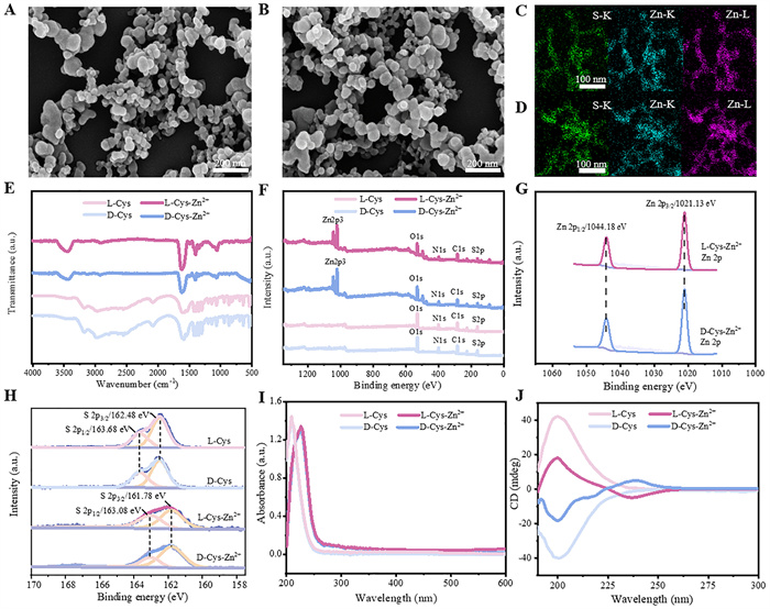 | Fig. 1. SEM image of (A) l-Cys-Zn2+and (B) d-Cys-Zn2+. EDX mapping image of (C) l-Cys-Zn2+ and (D) d-Cys-Zn2+. (E) FTIR spectra of l/d-Cys and l/d-Cys-Zn2+. (F) XPS spectra, (G) Zn 2p XPS spectra, (H) S 2p XPS spectra, (I) UV–vis absorption spectra and (J) CD spectra of l/d-Cys and l/d-Cys-Zn2+. | |