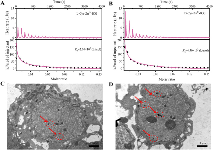 | Fig. 2. ITC results for the titration of liposome dispersion into (A) l-Cys-Zn2+-ICG and (B) d-Cys-Zn2+-ICG. Bio-TEM images of HeLa cells after being incubated with (C) l-Cys-Zn2+-ICG and (D) d-Cys-Zn2+-ICG. | |