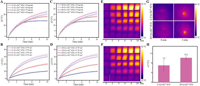 | Fig. 3. Photothermal heating curves of l-Cys-Zn2+-ICG (A, B) and d-Cys-Zn2+-ICG (C, D) dispersions at different concentrations or different laser power densities. (E) The infrared thermal images of l-Cys-Zn2+-ICG aqueous dispersions (1.00 mg/mL) upon different laser irradiation time. From top to bottom: l-Cys-Zn2+-ICG (2.0 W/cm2), l-Cys-Zn2+-ICG (1.5 W/cm2), l-Cys-Zn2+-ICG (1.0 W/cm2), l-Cys-Zn2+-ICG (0.5 W/cm2) and PBS solution (1.0 W/cm2). (F) The infrared thermal images of d-Cys-Zn2+-ICG aqueous dispersions (1.00 mg/mL) upon different laser irradiation time. From top to bottom: d-Cys-Zn2+-ICG (2.0 W/cm2), d-Cys-Zn2+-ICG (1.5 W/cm2), d-Cys-Zn2+-ICG (1.0 W/cm2), d-Cys-Zn2+-ICG (0.5 W/cm2) and PBS solution (1.0 W/cm2). (G) The infrared thermal images of l/d -Cys-Zn2+-ICG treated HeLa cells before and after 808 nm laser irradiation. (H) The quantification of the average temperature rises of l/d-Cys-Zn2+-ICG treated HeLa cells after 808 nm laser irradiation. Data were presented as mean ± SD. n=3. | |