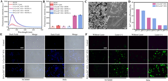| Fig. 4. (A) Fluorescence spectra and (B) fluorescence intensity (524 nm) of DCFH, l-Cys-Zn2+-ICG and d-Cys-Zn2+-ICG aqueous dispersions in the presence or absence of 808 nm laser irradiation. Data were presented as mean ± SD. n = 3. (C) SEM image of l-Cys-Zn2+-ICG and d-Cys-Zn2+-ICG at pH (left) 7.4 and (right) 6.5. (D) Zn2+ release efficiency of l/d-Cys-Zn2+-ICG at various pH conditions. (E) Fluorescence microscopic images of zinquin ethyl ester-stained NCM460 and HeLa cells after incubation with l/d-Cys-Zn2+-ICG for 4 h. Scale bar: 50 µm. (F) Fluorescence microscopic images of DCFH-DA-stained HeLa cells after various treatments. Scale bar: 50 µm. “+” represents the presence of laser irradiation. | |