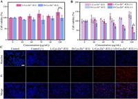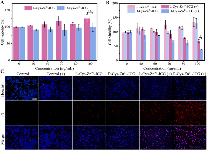 | Fig. 5. Cell viability of (A) NCM-460 cells and (B) HeLa cells after being incubated with different concentrations of l/d-Cys-Zn2+-ICG. (C) Fluorescence microscopic images of Hoechst/PI co-stained HeLa cells after various treatments. “+” represents laser irradiation, Scale bar: 100 µm. Data were presented as mean ± SD. n = 3. P < 0.05. | |