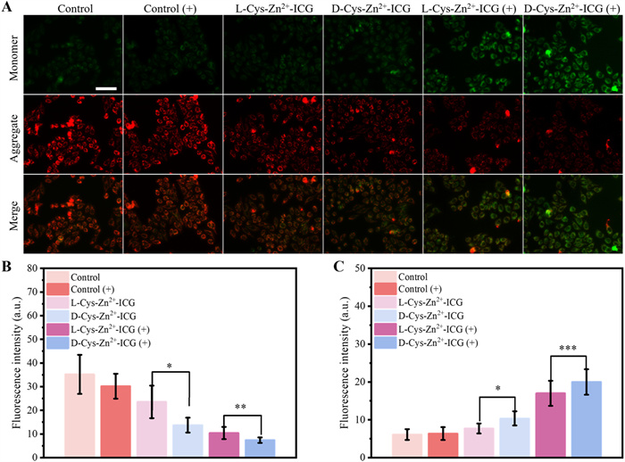 | Fig. 6. (A) Fluorescence microscopic images of JC-1-stained HeLa cells after various treatments. Scale bar: 50 µm. The quantification of the fluorescence intensity of (B) the red signal and (C) the green signal of A. “+” represents laser irradiation. Data were presented as mean ± SD. n=10. P < 0.05, **P < 0.01, ***P < 0.001. | |