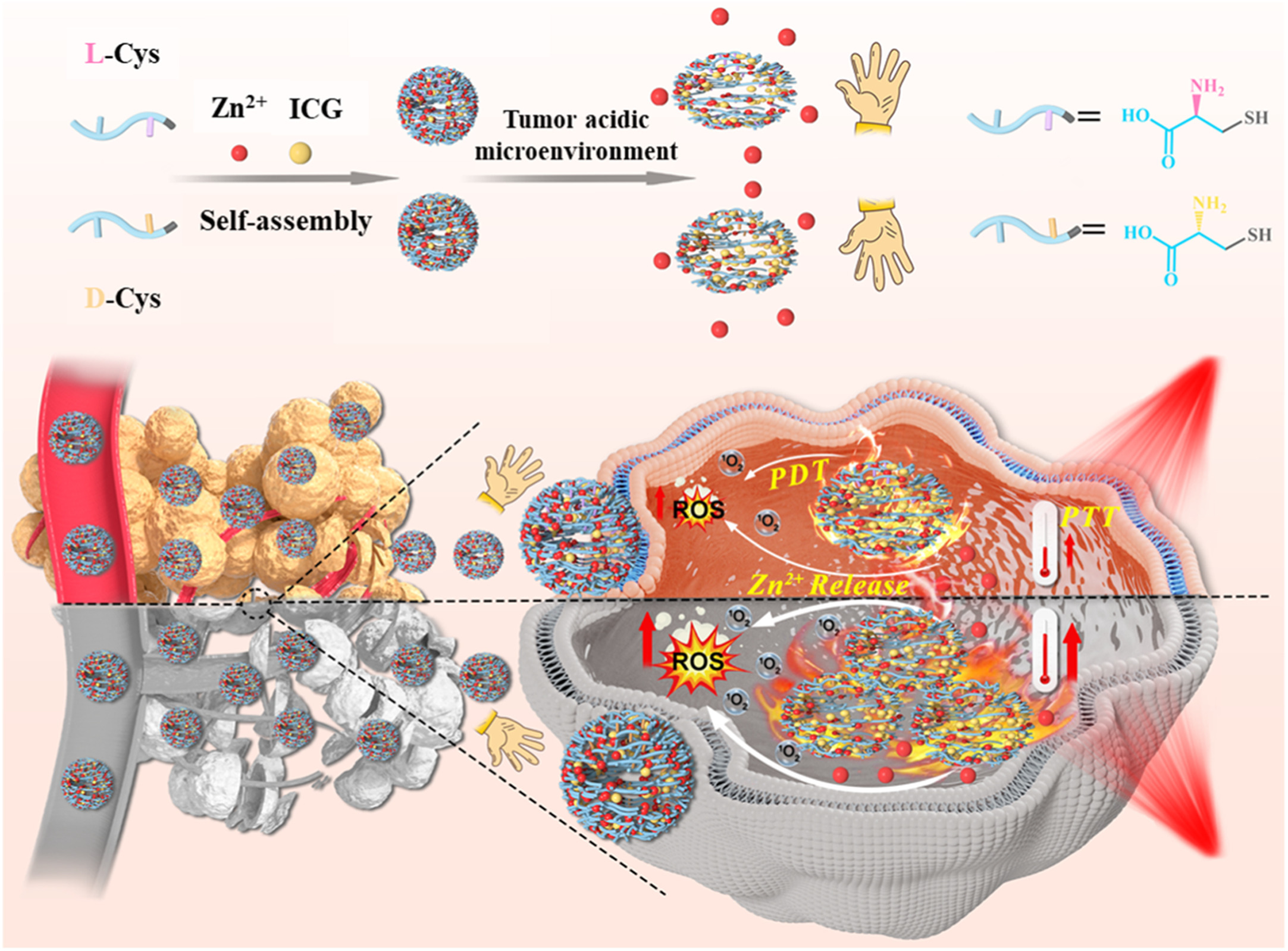 Cysteine (Cys) is one of the most abundant biothiols in living systems. Due to the presence of functional groups, i.e., carboxylate groups, amino groups and thiol groups (-SH), Cys can bind with metal ions, e.g., Zn2+ [29]. Since the pKa of the -SH of Cys is ∼7.4, close to normal physiological pH, the slight change of the biological microenvironment pH can vary the ionization state of -SH and thus the binding affinity between Cys and Zn2+ [30]. Therefore, the pH alteration in biological systems can manipulate the Zn2+ release behavior of Cys-Zn2+ related systems and initiate anti-tumor effect by increasing mitochondrial reactive oxygen species (ROS) via inhibiting the electron transport chain [31,32]. Considering the abovementioned facts, herein, we constructed chiral l/d-Cys-Zn2+ nanoparticles through the coordination between Cys and Zn2+. With further encapsulation of a photothermal and photodynamic agent (indocyanine green, ICG), chiral anti-tumor agents of l/d-Cys-Zn2+-ICG with the almost identical ICG encapsulation efficiency were prepared. Further results indicated that the l-Cys-Zn2+-ICG and d-Cys-Zn2+-ICG exhibited similar photothermal, photodynamic and pH-responsive Zn2+ release performance in aqueous dispersion. However, due to the higher cellular internalization efficiency, the more concentrated intracellular d-Cys-Zn2+-ICG induced better photothermal and photodynamic cancer therapeutic efficacy compared to l-Cys-Zn2+-ICG (Scheme 1). Moreover, the differential cellular internalization induced distinct intracellular Zn2+ release efficiency further amplified the chirality-specific anti-tumor efficacy. As a consequence, the d-Cys-Zn2+-ICG caused 1.93 times higher anti-tumor efficiency than the l-formed ones. The simultaneous function of the triple-level chirality-specific processes well confirmed the significance of chirality in regulating cancer therapeutic efficacy.