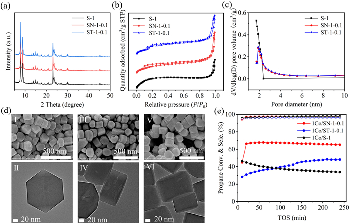 | Fig. 1. (a) XRD patterns of S-1 zeolites treated with different alkaline sources. (b) N2 adsorption-desorption isotherms and (c) pore size distributions from BJH adsorption for zeolites. (d) SEM and TEM images: Ⅰ-Ⅱ, S-1; Ⅲ-Ⅳ, SN-1–0.1; Ⅴ-Ⅵ, ST-1–0.1. (e) Propane conversion and propylene selectivity (reaction conditions: 580 ℃, 0.2 g catalyst, 5 vol% propane balanced with N2, 10 mL/min). | |