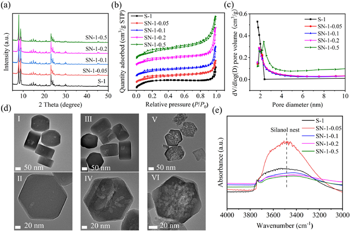 | Fig. 2. (a) XRD patterns of S-1 zeolites treated with different alkaline concentrations. (b) N2 adsorption-desorption isotherms and (c) pore size distributions from BJH adsorption for zeolites. (d) TEM images: Ⅰ-Ⅱ, SN-1–0.05; Ⅲ, SN-1–0.1; Ⅳ, SN-1–0.2; Ⅴ-Ⅵ, SN-1–0.5. (e) OH-FTIR spectra. | |