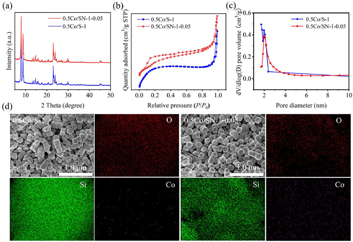 | Fig. 3. (a) XRD patterns of 0.5Co/S-1 and 0.5Co/SN-1–0.05. (b) N2 adsorption-desorption isotherms and (c) pore size distributions from BJH adsorption for zeolites. (d) SEM and EDS images. | |