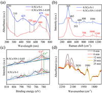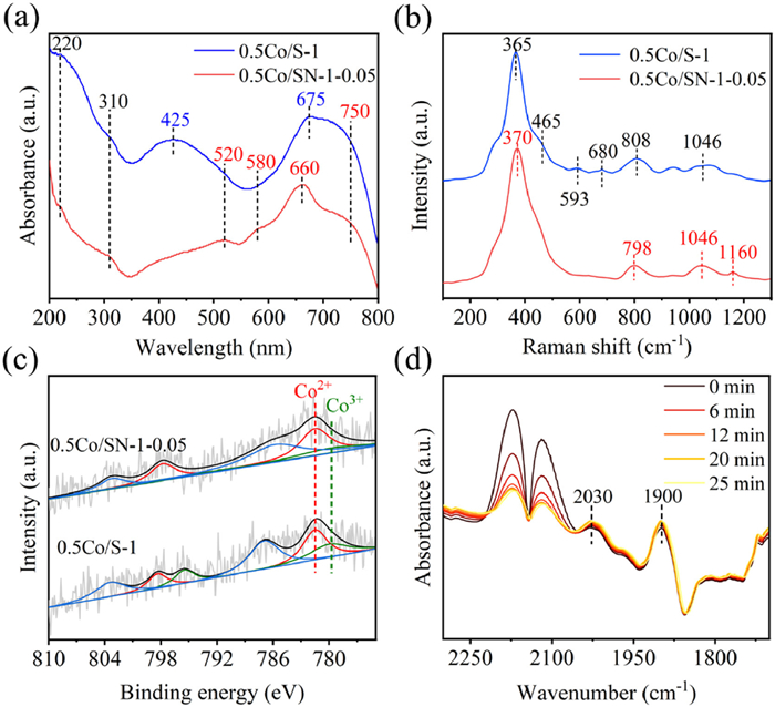 | Fig. 5. (a) UV–vis spectra of 0.5Co/S-1 and 0.5Co/SN-1–0.05 catalysts. (b) Raman spectra of 0.5Co/S-1 and 0.5Co/SN-1–0.05 catalysts. (c) XPS profiles of 0.5Co/S-1 and 0.5Co/SN-1–0.05 catalysts. (d) In-situ DRIFT spectra with CO flows. | |