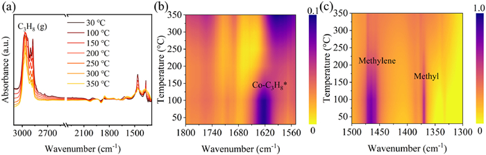 | Fig. 6. (a) In situ C3H8-DRIFT spectra. (b, c) Color mapping spectra. | |