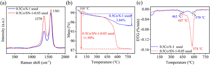 | Fig. 7. (a) UV-Raman, (b) TGA and (c) DTG over 0.5Co/S-1 and 0.5Co/SN-1–0.05 catalysts after reaction. | |