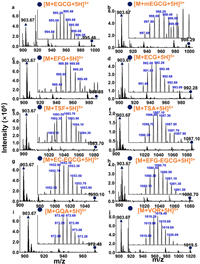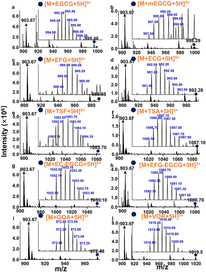 Taking the EC-EGCG as an example (Fig. 1a and Fig. 2g) for the explanation, a mass signal of the Aβ1–42-ligand complex ([M + 746+5H]5+) was found at 9.39 min in the extracted ion chromatogram (EIC). In addition to the 5-charged ion signal, the signals of 4-charge (m/z: 1316.12) and 6-charge (m/z: 875.25) complex ions were also found. Within this retention time, we found a mass peak of 745, corresponding to [MEC-EGCG-H]- from the EIC of green tea extracts. Therefore, this complex could be deduced to Aβ1–42-EC-EGCG, and EC-EGCC could be a potential ligand bound to Aβ1–42. Eventually we screened 10 molecules from the green tea extracts that could form complexes with Aβ1–42. Figs. 2a–j showed the mass spectra of 10 complexes with the 5-charged adduct ions, and the 10 potential ligands bound to Aβ1–42 were listed in Table 1, which containing 4 catechins (epigallocatechin gallate (EGCG), epigallocatechin 3-(3-methyl-gallate) (mEGCG), epicatechin gallate (ECG) and epiafzelechin 3-gallate (EFG)), 4 dimers of catechins epicatechin (4β→8)-epigallocatechin 3-O-gallate (EC-EGCG), theasinensin A (TSA), (theasinensin F (TSF) and epiafzelechin 3-O-gallate-(4β→8)-epigallocatechin 3-O-gallate (EFG-EGCG)) and 2 kinds of other polyphenol (galloylquinic acid (GQA) and vitexin-2′'-O-rhamnoside (VOR)).
