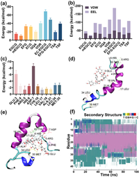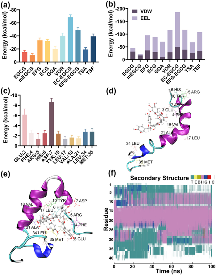 | Fig. 3. MD simulation analysis of 10 complexes. (a) The binding free energy of 10 ligands. (b) The gas phase energy of ligands: van der Waals energy (VDW) and electrostatic energy (EEL). (c) The energy components (per-residue) of EC-EGCG. Data are presented as mean ± standard deviation (SD) (n = 500). (d) Structure of EC-EGCG molecule and Aβ1–42 before MD simulation taken at 0 ns. (e) A representative structure of EC-EGCG molecule bound to Aβ1–42 taken at 90 ns. (f) The time evolution of the secondary structures of Aβ1–42 in presence of EC-EGCG (T, turn; E, extended conformation; B, isolated bridge; H, alpha helix; G, 3–10 helix; I, pi-helix; C, coil). | |