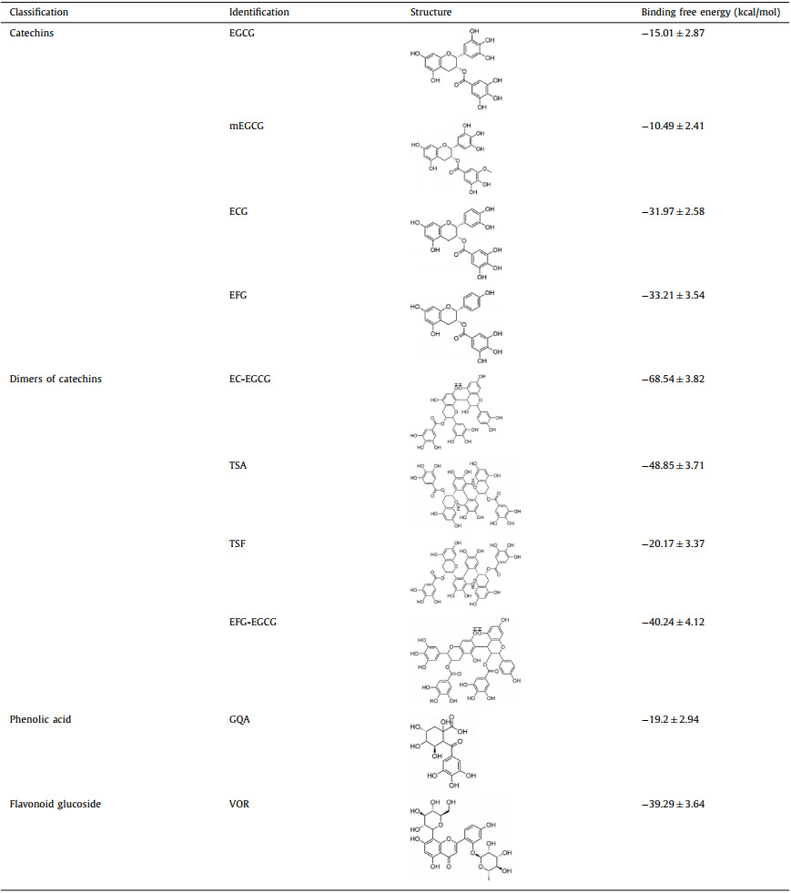 The pathology of AD is characterized by the accumulation of extracellular amyloid-β (Aβ) senile plaques and intracellular neurofibrillary tangles of Tau proteins [20]. Aβ is produced by sequential cleavage of the amyloid precursor protein by β- and γ-secretase, and the length of which is variable from 39 to 43 residues [21]. Among them, Aβ1-42 has the highest cytotoxic and aggregation propensity. Pro-fibrillation of Aβ involves the formation of neurotoxic soluble oligomers, protofibrils and amyloid protofibrils [22,23]. Currently for the treatment of AD, scientists have carried out a lot of research on inhibitors targeting Aβ aggregation as well as depolymerization or re-modelling of amyloid fibrils, by using antibodies, nanoparticles and small molecules, etc. [24–29]. Therefore, Aβ1-42 was chosen to seek its ligands from green tea.