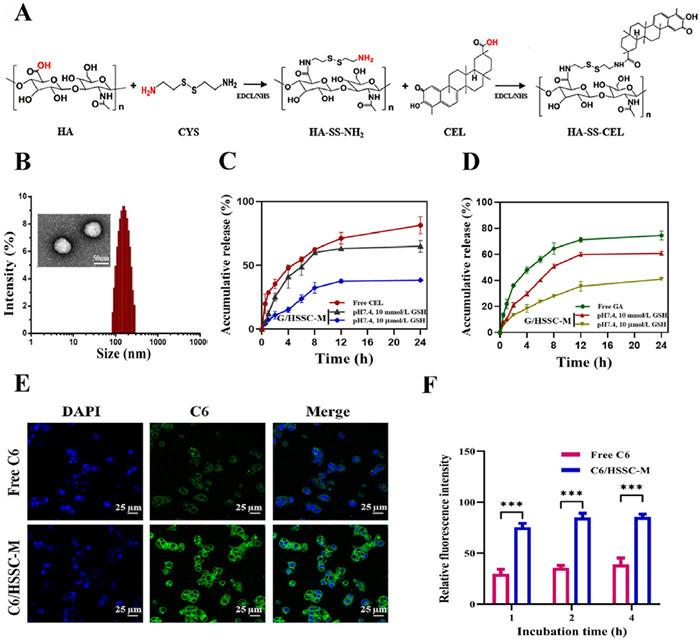 | Fig. 1. Preparation and characterization of G/HSSC-M. (A) Synthesis approach of HA-SS-CEL prodrug by two-step amide reaction. (B) The particle size and morphology of G/HSSC-M. Redox-responsive release of CEL (C) and GA (D) from G/HSSC-M in vitro. (E) HepG2 cells incubated with free C6 and C6/HSSC-M for 4 h were observed by CLSM. (F) Quantitative analysis of cellular uptake of free C6 and C6/HSSC-M in HepG2 cells for 1, 2 and 4 h, respectively. ***P < 0.001. Mean ± SD (n = 3). | |