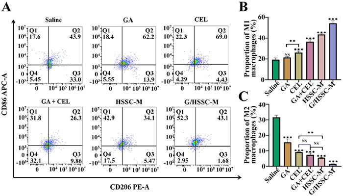 | Fig. 3. The regulatory effect of G/HSSC-M on tumor immune microenvironment. (A) The expression of CD86 and CD206 in tumor tissues of different groups detected by flow cytometry. Quantitative results of M1 macrophages (B) and M2 macrophages (C). P < 0.05, **P < 0.01, ***P < 0.001 vs. the saline group. Mean ± SD (n = 3). | |