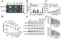 | Fig. 2. In vivo distribution and anti-tumor study of G/HSSC-M. (A) In vitro fluorescence imaging of tumors and major organs 72 h after tail vein injection. (B) The corresponding average fluorescence intensity (n = 3). (C) The growth curves of tumor tissue in different groups. (D) Tumor weight in each group at day 21 (n = 6). P < 0.05, **P < 0.01, ***P < 0.001. (E) The expression of JAK1, p-JAK1, STAT3 and p-STAT3 protein in tumor tissues of each treatment group. (F) Quantitative results of p-JAK1/JAK1 and p-STAT3/STAT3 (n = 3). P < 0.05, **P < 0.01 vs. the saline group. Mean ± SD. NS, no significant difference. | |